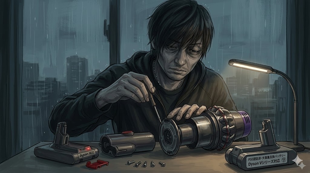 ダイソンVシリーズの導入から約3年が経過すると、リチウムイオン電池の経年劣化により、特に「ハイパワーモード(強モード)」での連続稼働時間が著しく低下します。本稿では、メーカー純正品と、2026年現在の安全基準を満たした互換バッテリーの性能を論理的に比較・検証します。
